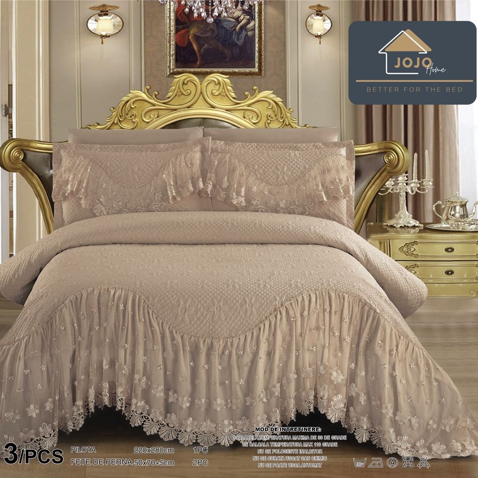 Cuvertura de pat cu volanase + 2 fete de perne confectionate din bumbac tip finet. Cuverturile de pat confectionate din bumbac finet avand volanase da cu siguranta o nota eleganta dormitorului tau si se potrivesc indiferent de sezon. Totodata, ele adauga un plus de unicitate dormitorului tau datorita broderiilor deosebite. Broderiile acestui set (cuvertura de pat plus fete de perna) sunt realizate cu ajutorul celor mai noi tehnologii – garantat nu se decoloreaza daca se respecta instructiunile de intretinere. Setul vine ambalat in husa de plastic – poate fi folosita ca husa pentru depozitare.