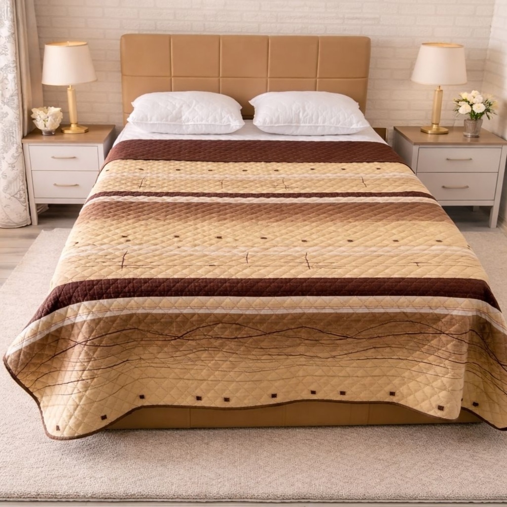 Cuvertura de pat matlasata cu tehnologia ultrasonic confectionata din polyester. Cuvertura dispune de doua fete, una cu model imprimat modern, cealalta cu o nuanta uni in ton cu modelul principal.