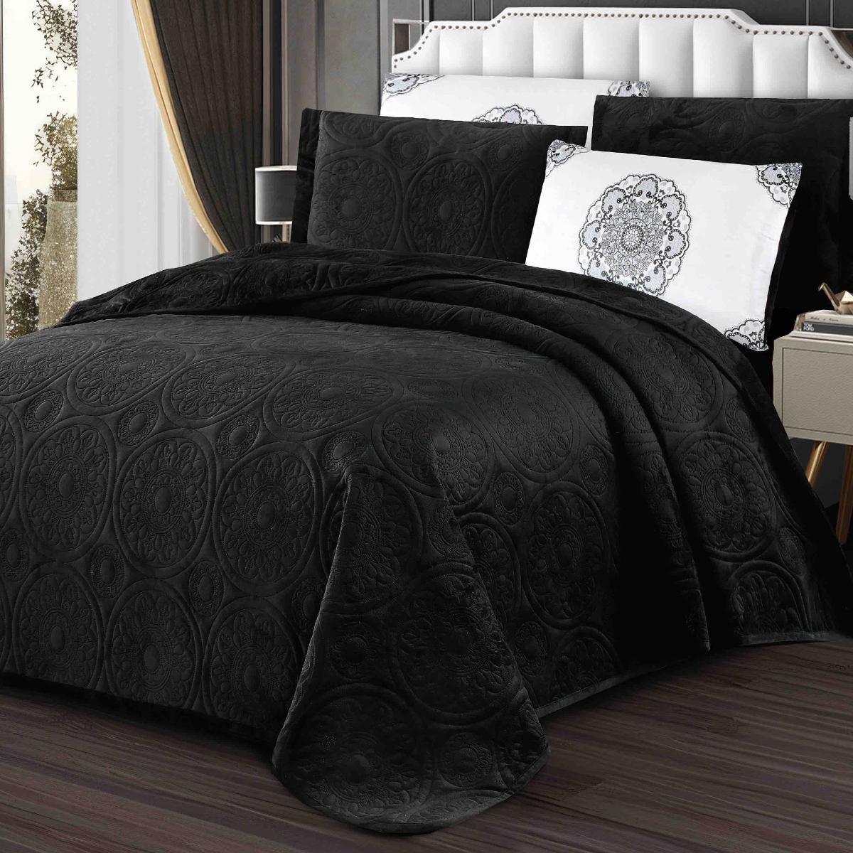 Set premium de cuvertura de pat din material catifelat tip emboss. Setul este compus din cuvertura de pat pentru pat dublu + 4 fete de perne confectionate din material catifelat. Cuverturile de pat sunt potrivite indiferent de anotimp. Totodata, ele adauga mai multa caldura dar si bun gust dormitorului tau. Imprimeul acestui set (cuvertura pat plus fete de perna) este realizat cu cele mai noi tehnologii – garantat nu se decoloreaza daca se respecta instructiunile de intretinere. Setul vine ambalat in husa de plastic – poate fi folosita ca husa pentru depozitare.