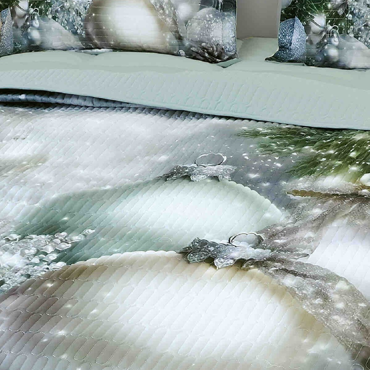 Cuvertura de pat print digital 5D + 2 fete de perne confectionate din finet gros. Cuverturile de pat confectionate din bumbac finet vor da cu siguranta o nota eleganta dormitorului tau si se potrivesc indeosebi de Craciun. Totodata, ele adauga un plus de unicitate dormitorului tau datorita imprimeurilor digitale deosebite si rezistente. Aceste imprimeuri de Craciun ale acestui set (cuvertura de pat plus fete de perna) sunt realizate cu ajutorul celor mai noi tehnologii – garantat nu se decoloreaza daca se respecta instructiunile de intretinere. Setul vine ambalat in husa de plastic – poate fi folosita ca husa pentru depozitare.