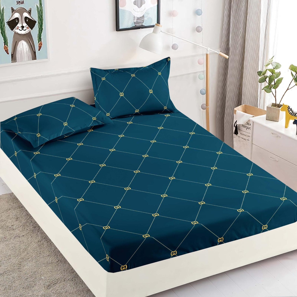 Husa de pat cu elastic + 2 Fete de Perna, Pat 2 Persoane, Albastru cu Carouri Galbene – JoJo Home – PUF236562