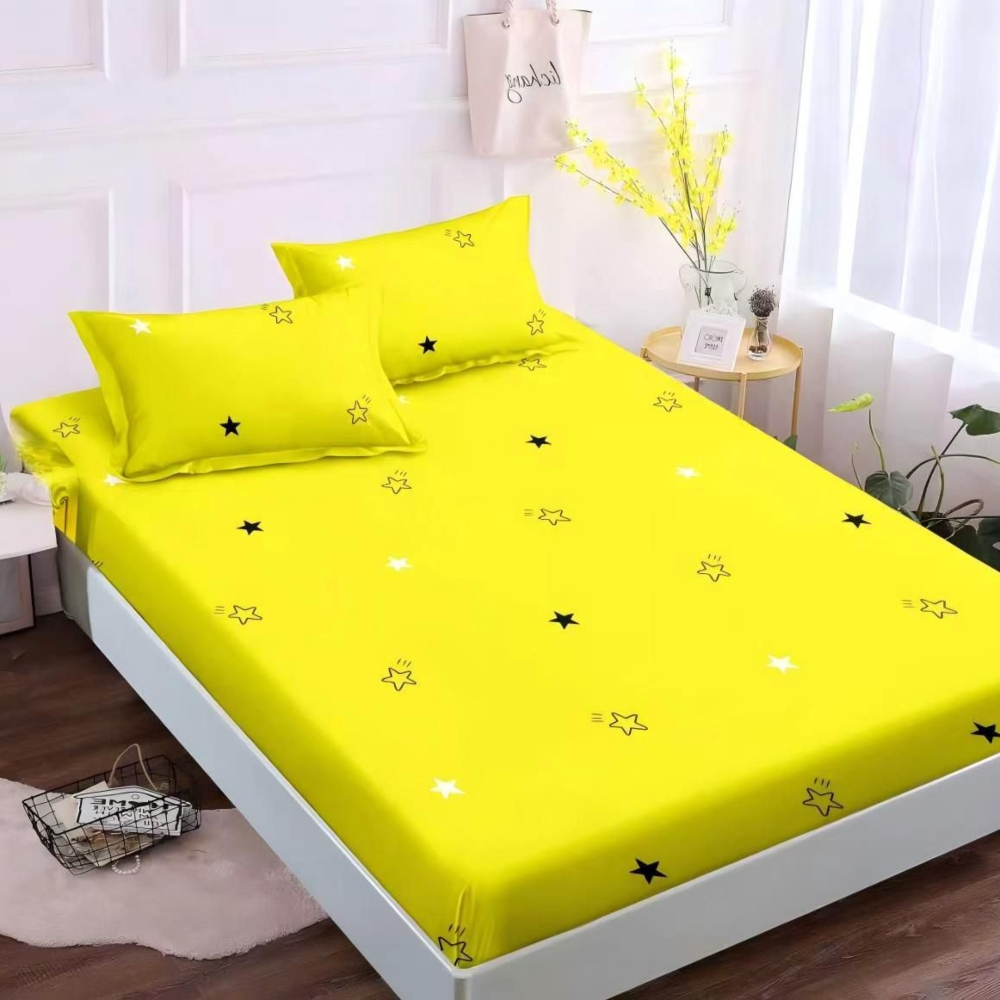 Husa de pat cu elastic + 2 Fete de Perna, Pat 2 Persoane, Galbena cu Stelute – JoJo Home – PUF236571