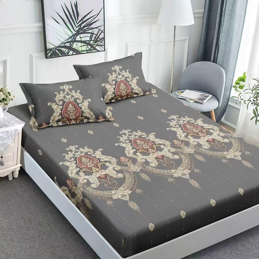 Husa de pat cu elastic + 2 Fete de Perna, Pat 2 Persoane, Gri cu Ornamente – JoJo Home – PUF236565
