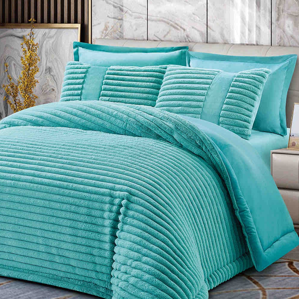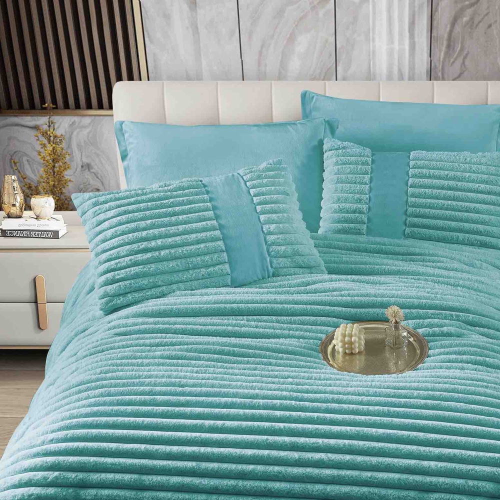 Lenjerie de Pat cu Elastic + Pilota Cocolino din Blanita Artificiala de Iepure, 6 Piese, Pat 2 Persoane – Turcoaz – PUF73569