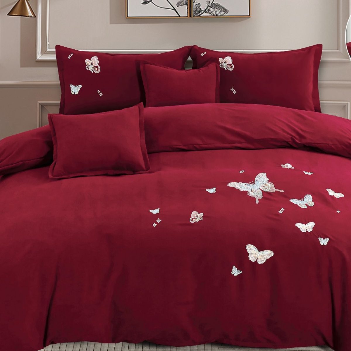 Lenjerie de Pat cu Fluturi Brodati din Finet Superior, Cearceaf cu Elastic, 6 Piese, Pat 2 Persoane – Grena – PUF232003-08