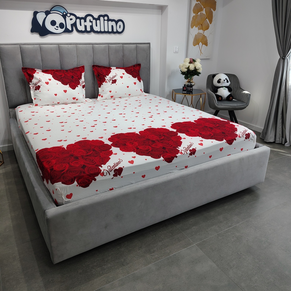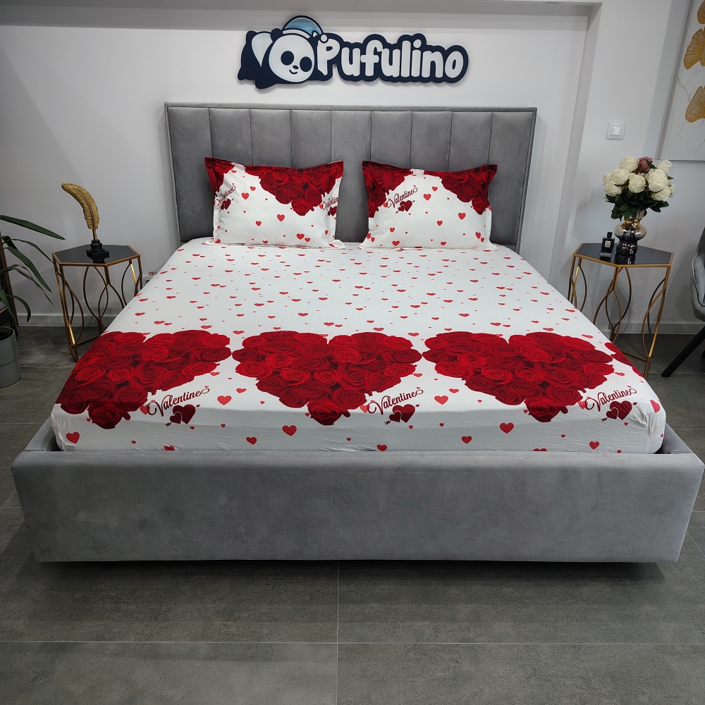 1. Husa de pat cu elastic si 2 fete de perna confectionata din bumbac finet. Husa beneficiaza de sistem de prindere inteligent, cu elastic, ce ii permite sa aiba o pozitie fixa pe saltea indiferent de moment.