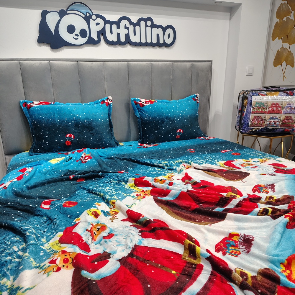 Husa de pat cu elastic si 2 fete de perna confectionata din microfibra Cocolino cu model de Crăciun. Husa beneficiaza de sistem de prindere inteligent, cu elastic, ce ii permite sa aiba o pozitie fixa pe saltea indiferent de moment.