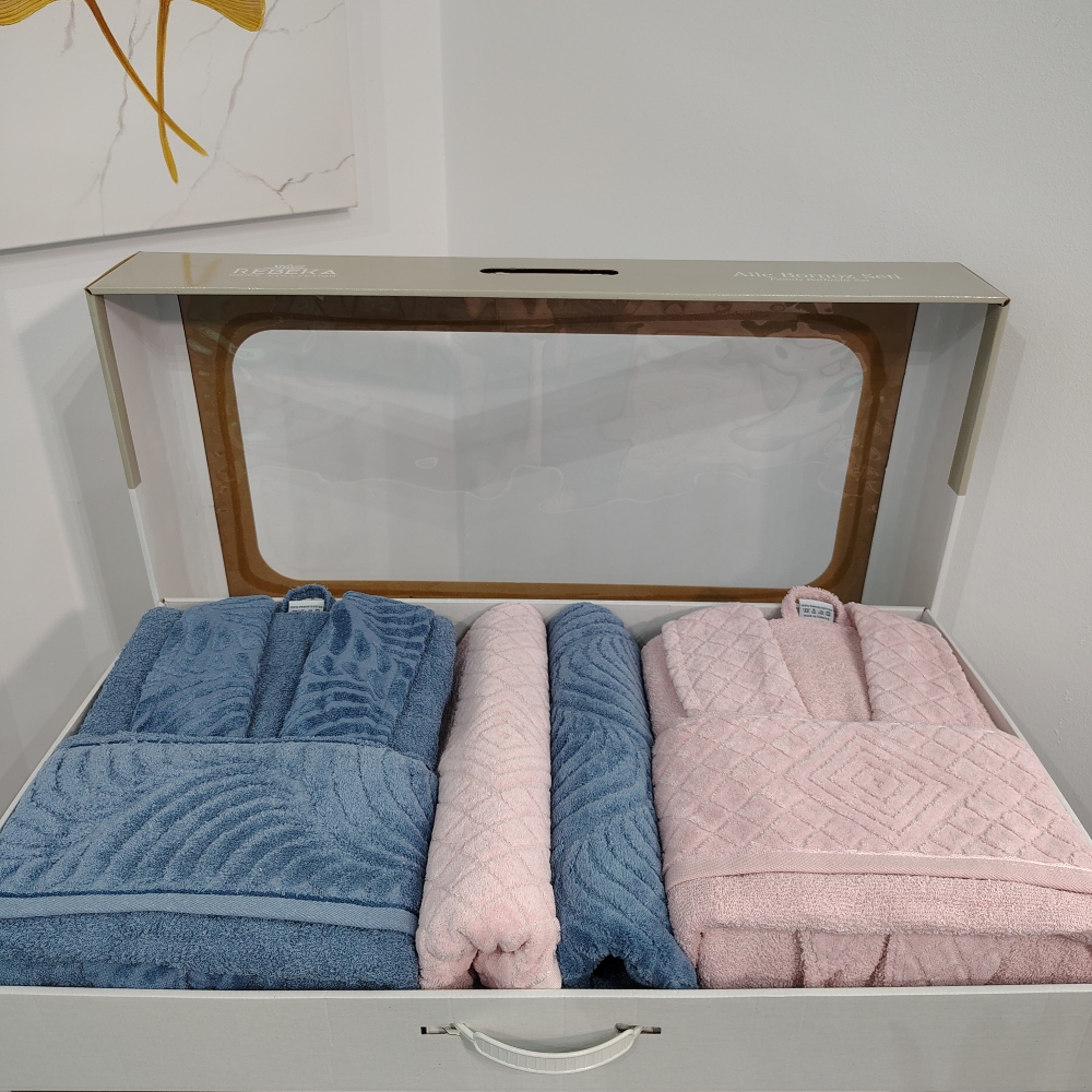 Set Cadou 6 Piese: Halate de Baie + Prosoape din Bumbac 100%, Roz Pudra & Albastru – Rebeka – PUF237129