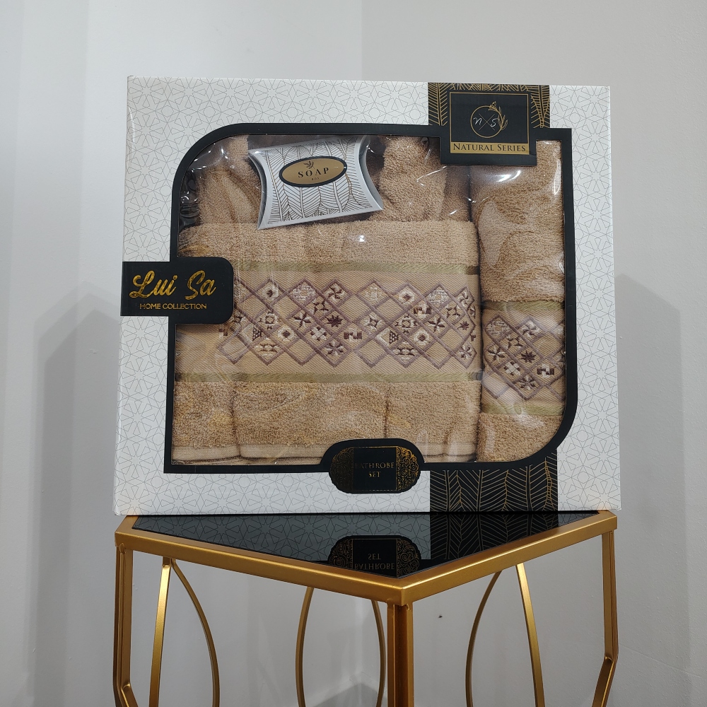 Set Cadou Single: Halat de Baie + Prosoape din Bumbac 100%, 4 Piese, Bej – Luisa – PUF95881