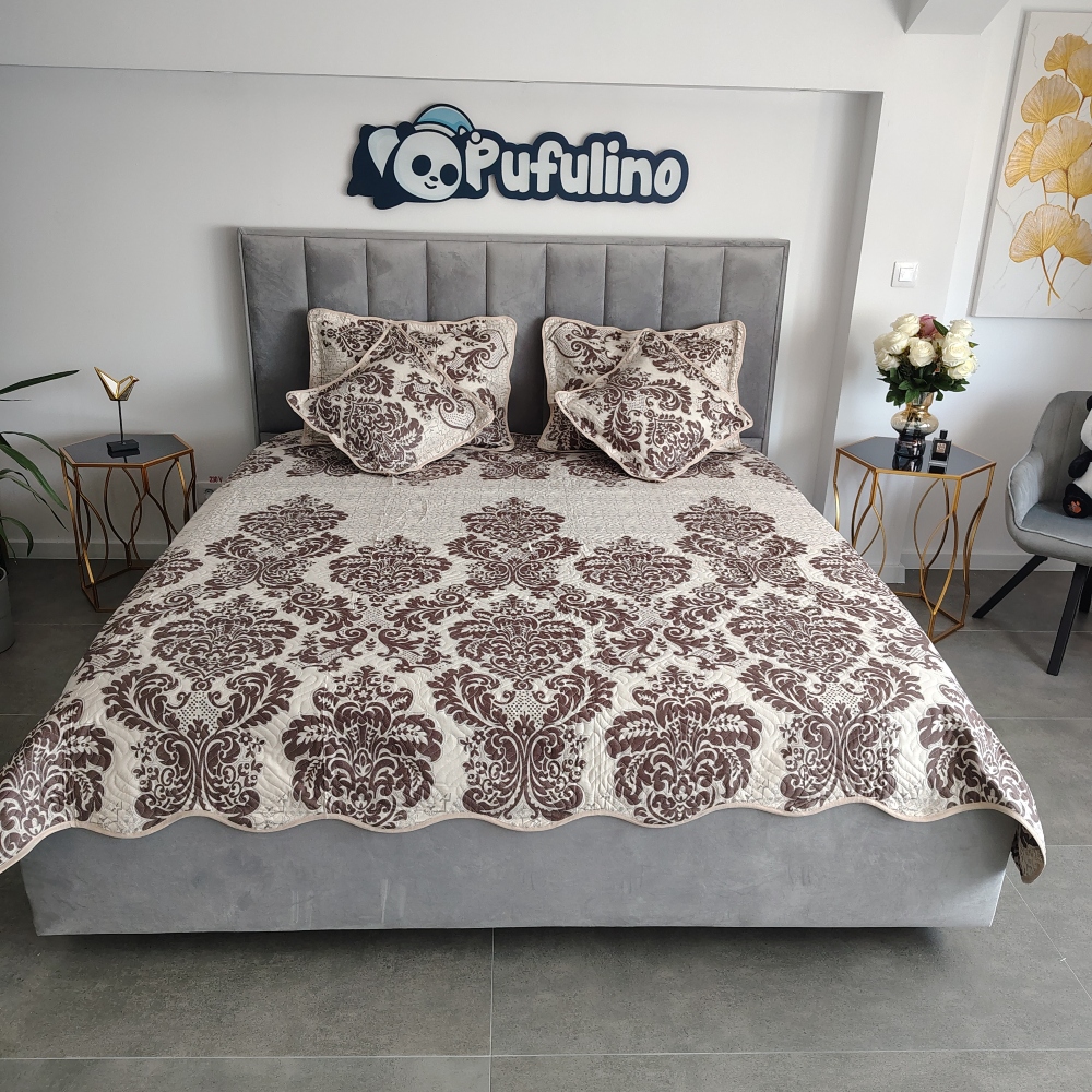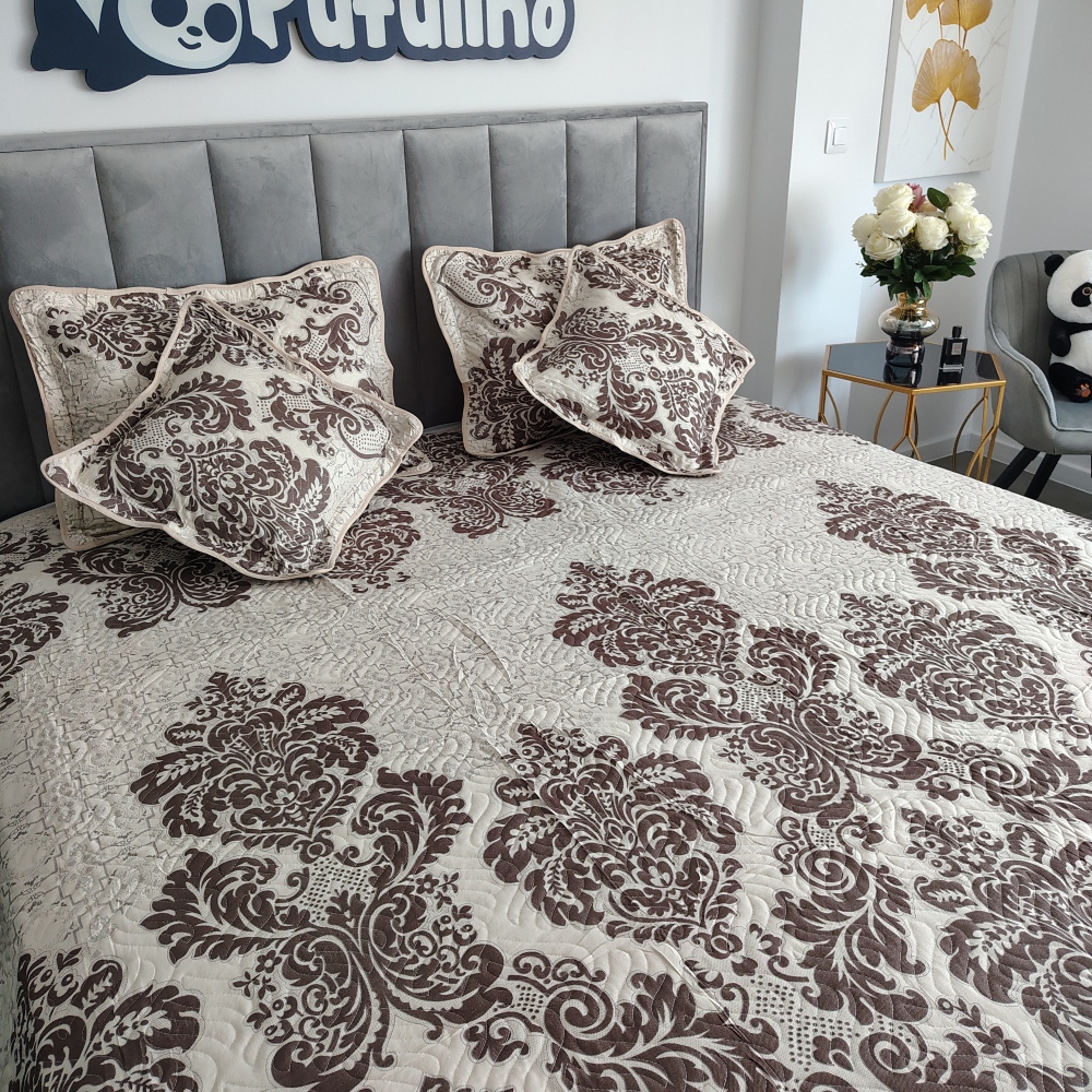 Cuvertura de pat + 4 fete de perne confectionate din bumbac. Cuverturile de pat sunt potrivite pentru orice anotimp. Totodata, ele adauga un plus de unicitate dormitorului tau prin imprimeul deosebit. Imprimeul acestui set (cuvertura pat plus fete de perna) este realizat cu cele mai noi tehnologii – garantat nu se decoloreaza daca se respecta instructiunile de intretinere. Setul vine ambalat in husa de plastic – poate fi folosita ca husa pentru depozitare.