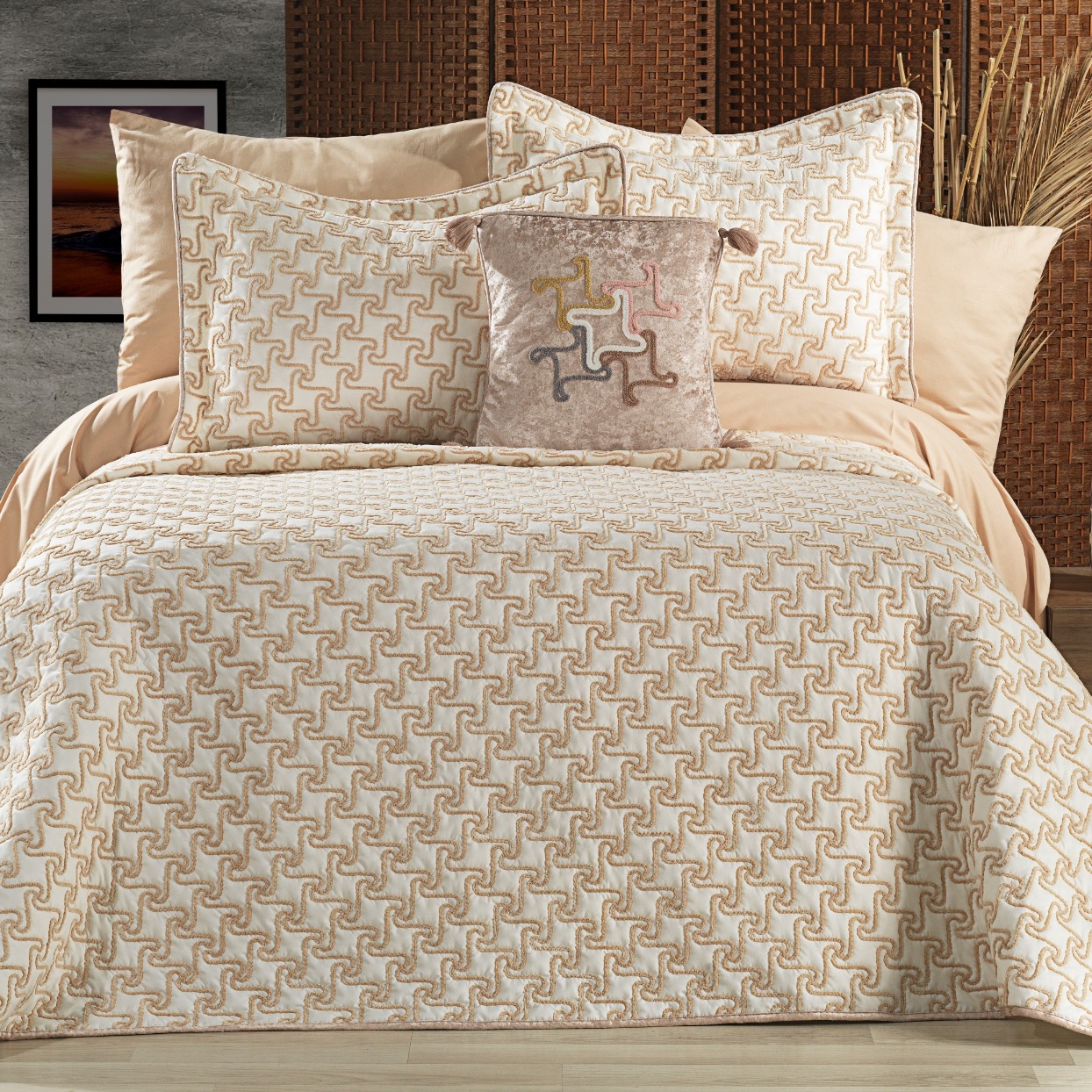 Set Luxury Aria Crem/Cappuccino: Cuvertura, Cearceaf de Pat, 4 Fete Perna + Fata Perna Decorativa, 7 Piese – Brillant – PUF237275