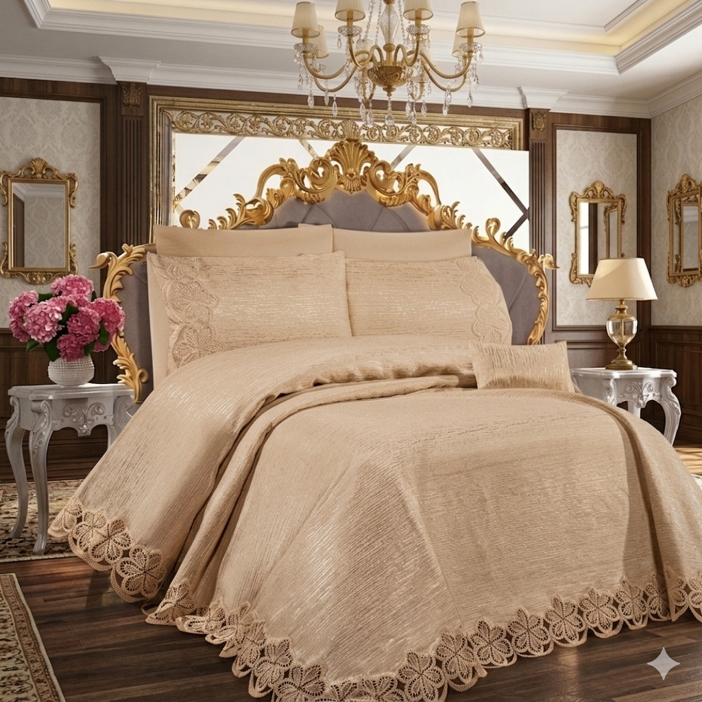 Set Luxury RITA 7 Piese: Cuvertura, Cearsaf de Pat + 5 Fete de Perna, Pat Matrimonial – Bej – PUF237313