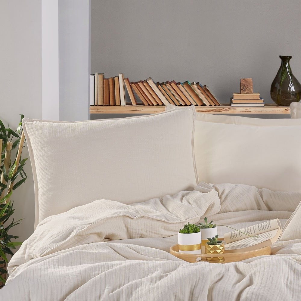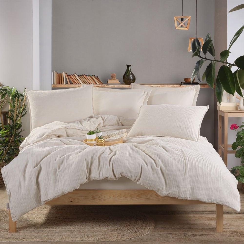 Redefinește stilul dormitorului tău cu setul nostru din muselină, materialul vedetă al momentului în materie de design interior. Realizată din bumbac 100% cu un fir special și exclusiv, această lenjerie oferă o textură extrem de fină și catifelată la atingere.