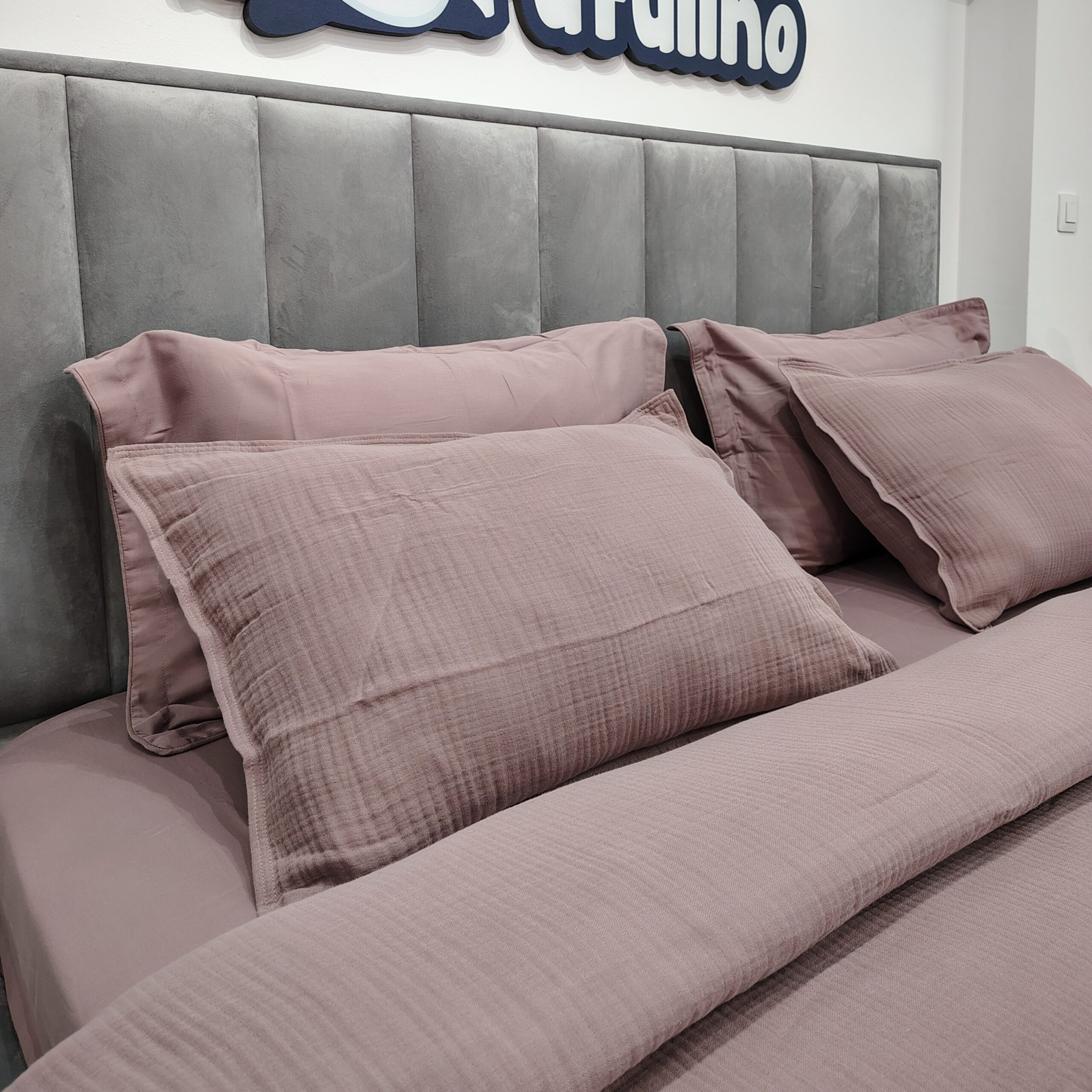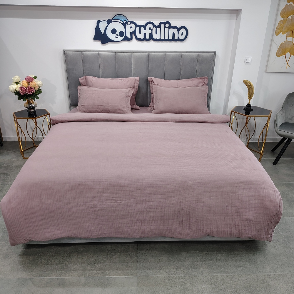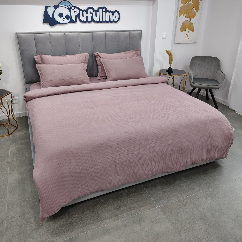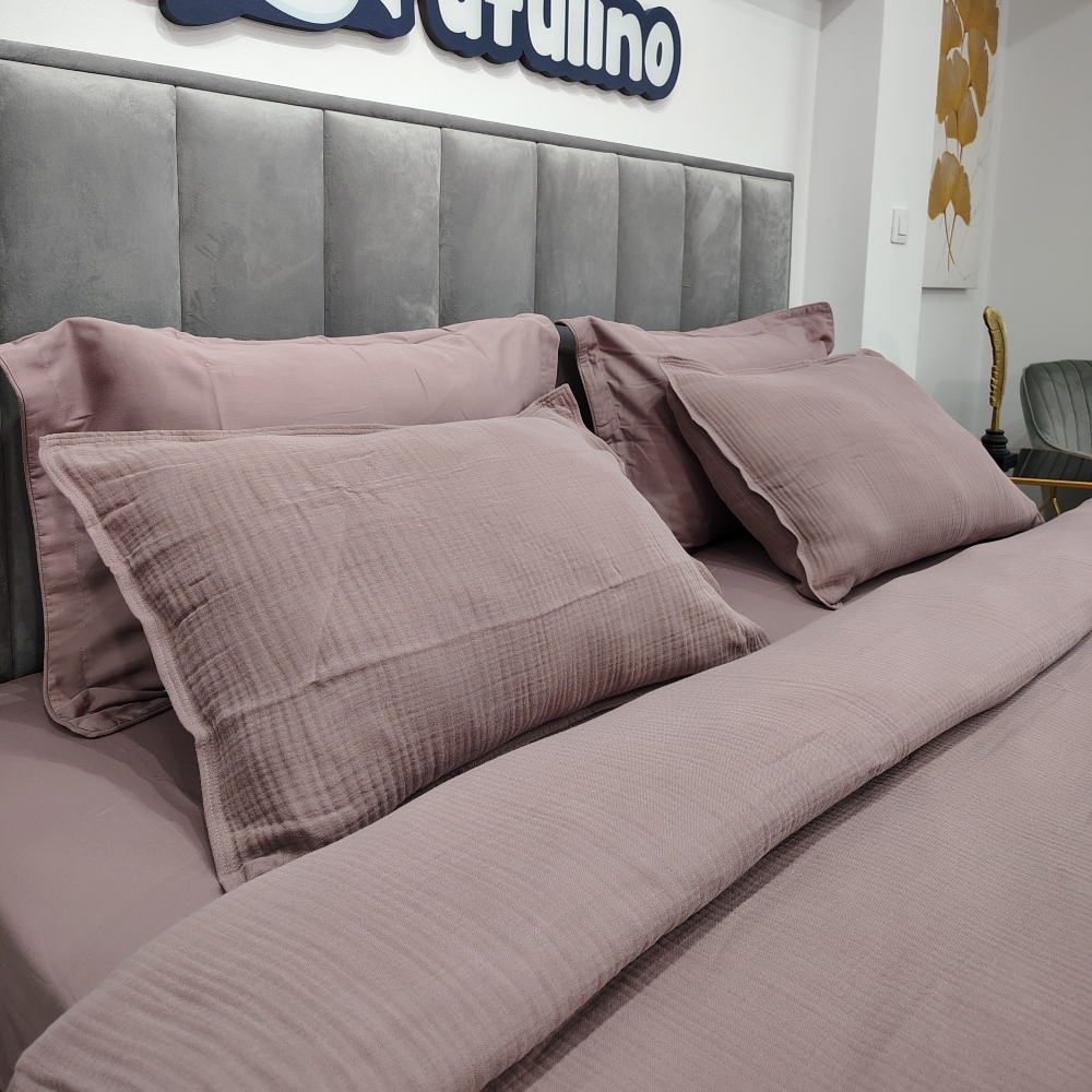 Redefinește stilul dormitorului tău cu setul nostru din muselină, materialul vedetă al momentului în materie de design interior. Realizată din bumbac 100% cu un fir special și exclusiv, această lenjerie oferă o textură extrem de fină și catifelată la atingere.